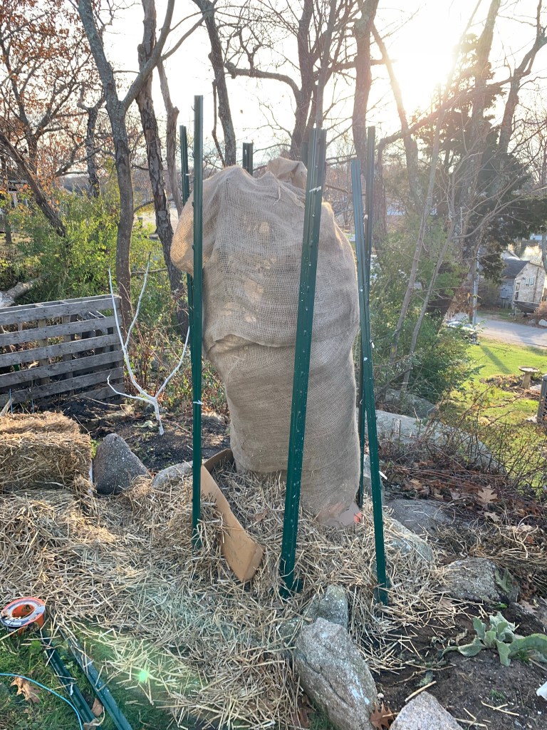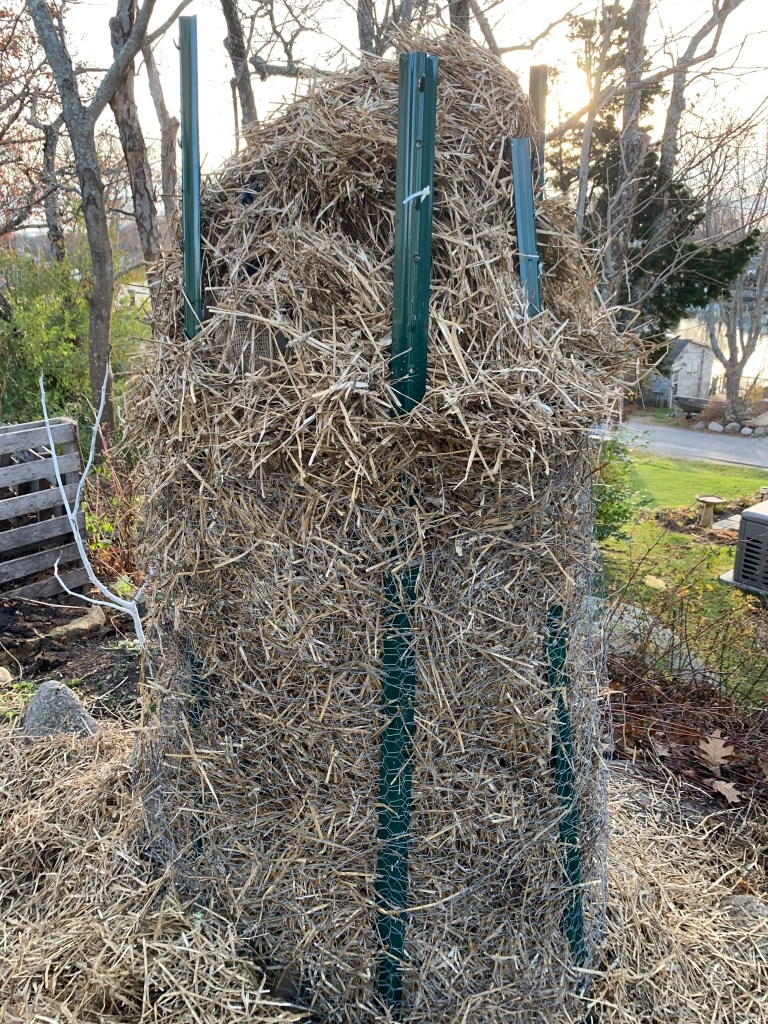 Leaves or straw for a blanket. Then black tar paper taped with gorrila tape (will find a pic later) and a bucket or trash can on top. It’s a pain but worth it. Wrap around thanksgiving and unwrap in April ish or keep in containers unwrapped in garage like the two by the fire hydrant above.